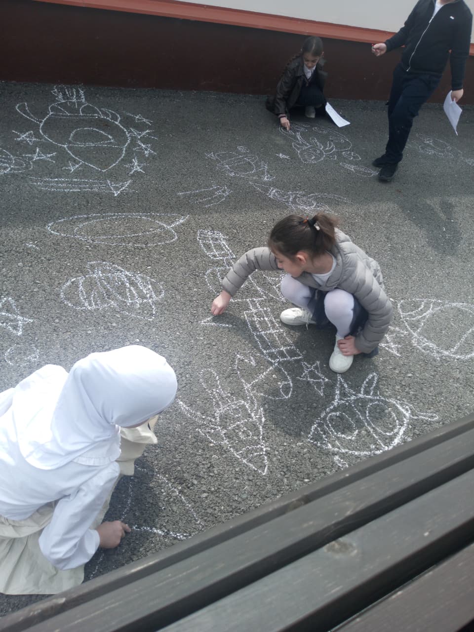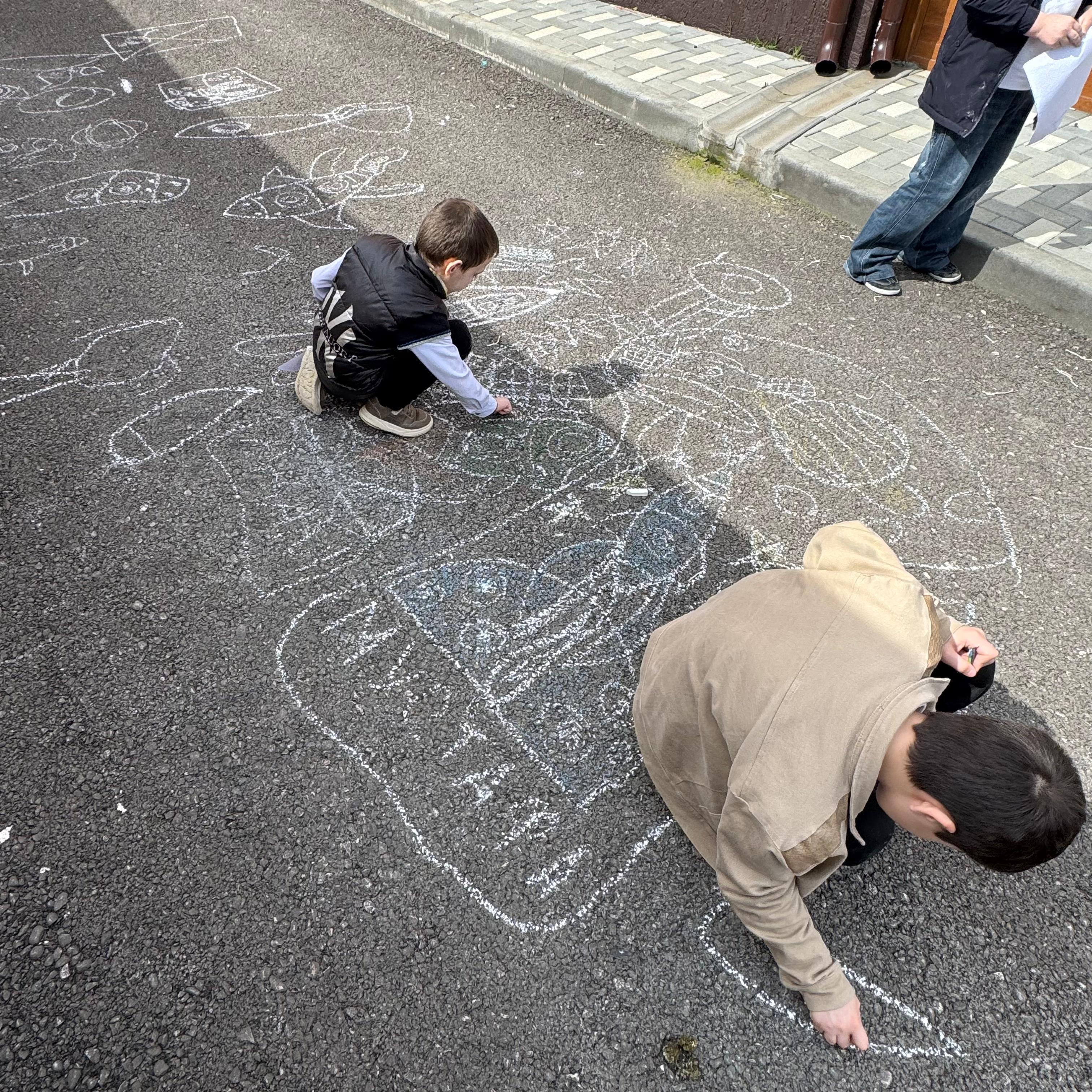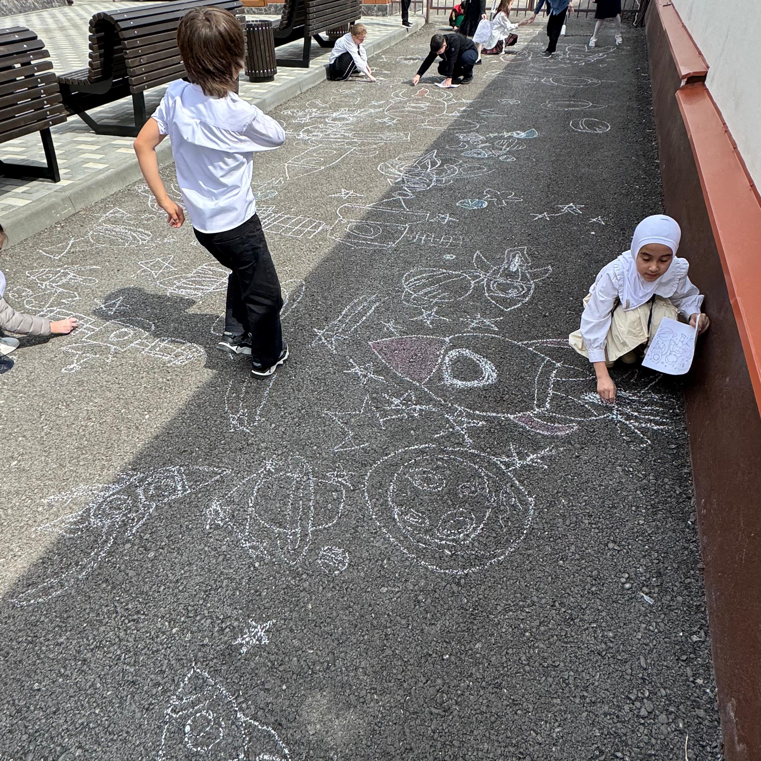 Ребята с большим увлечением играли цветными мелками, и вскоре асфальт на территории гимназии покрылся яркими рисунками. В них дети изображали ракету, небо со звездами, нарисовали космонавта.  Детское творчество в технике коллективного рисунка мелом на асфальте позволяет не только проявить творческие способности, но зарядиться хорошим настроением и радостью от собственных «шедевров». С днем космонавтики!