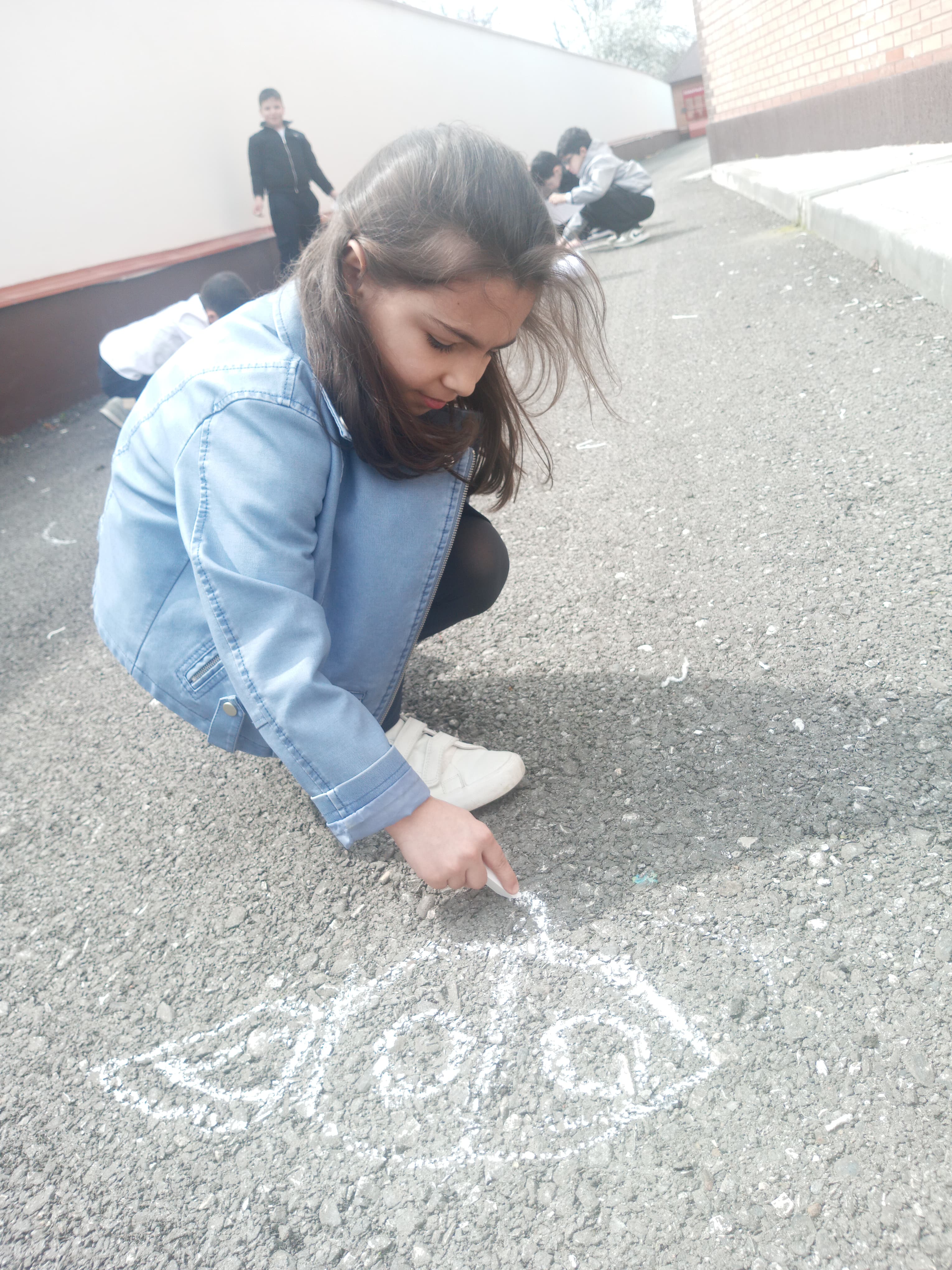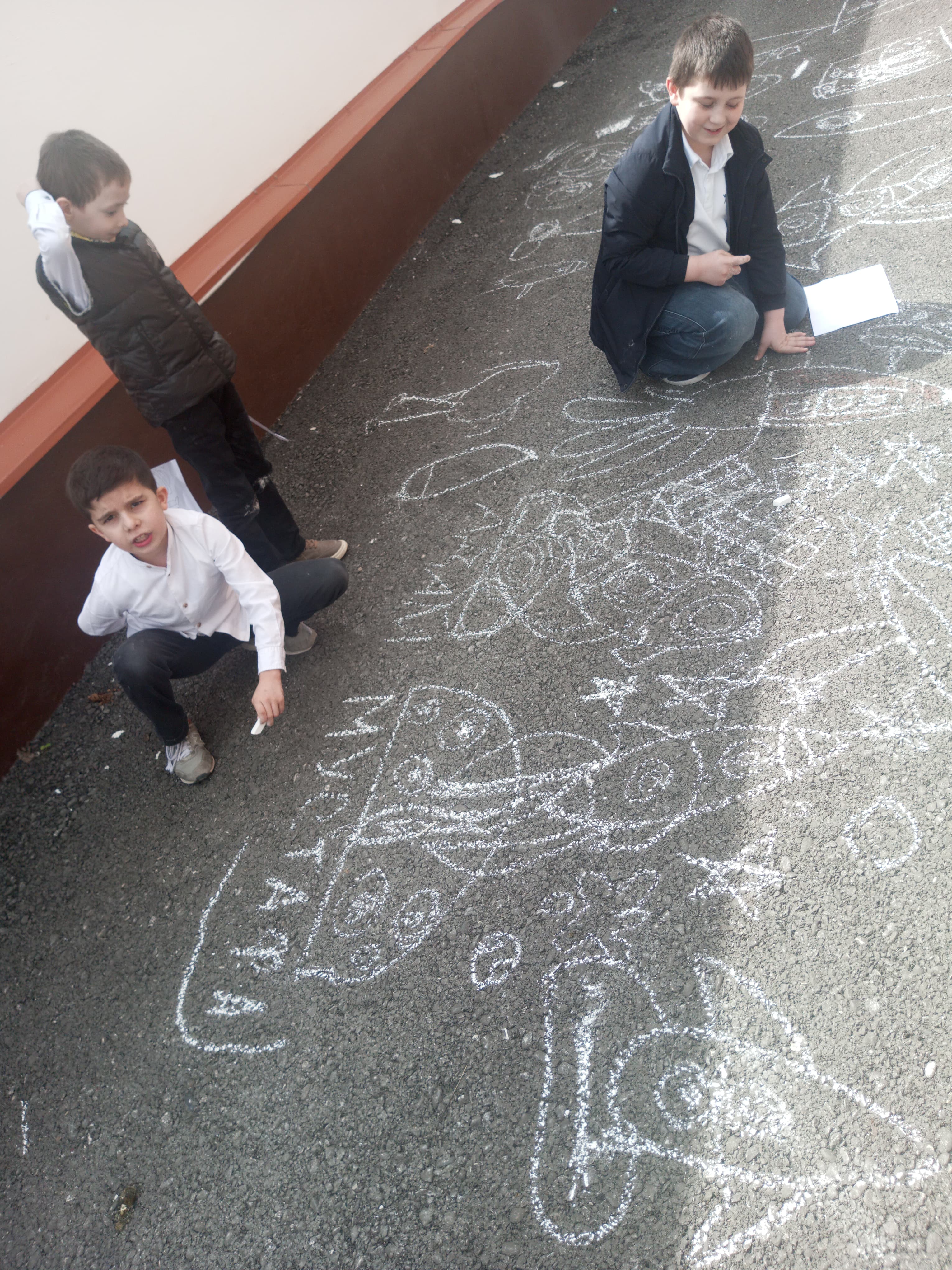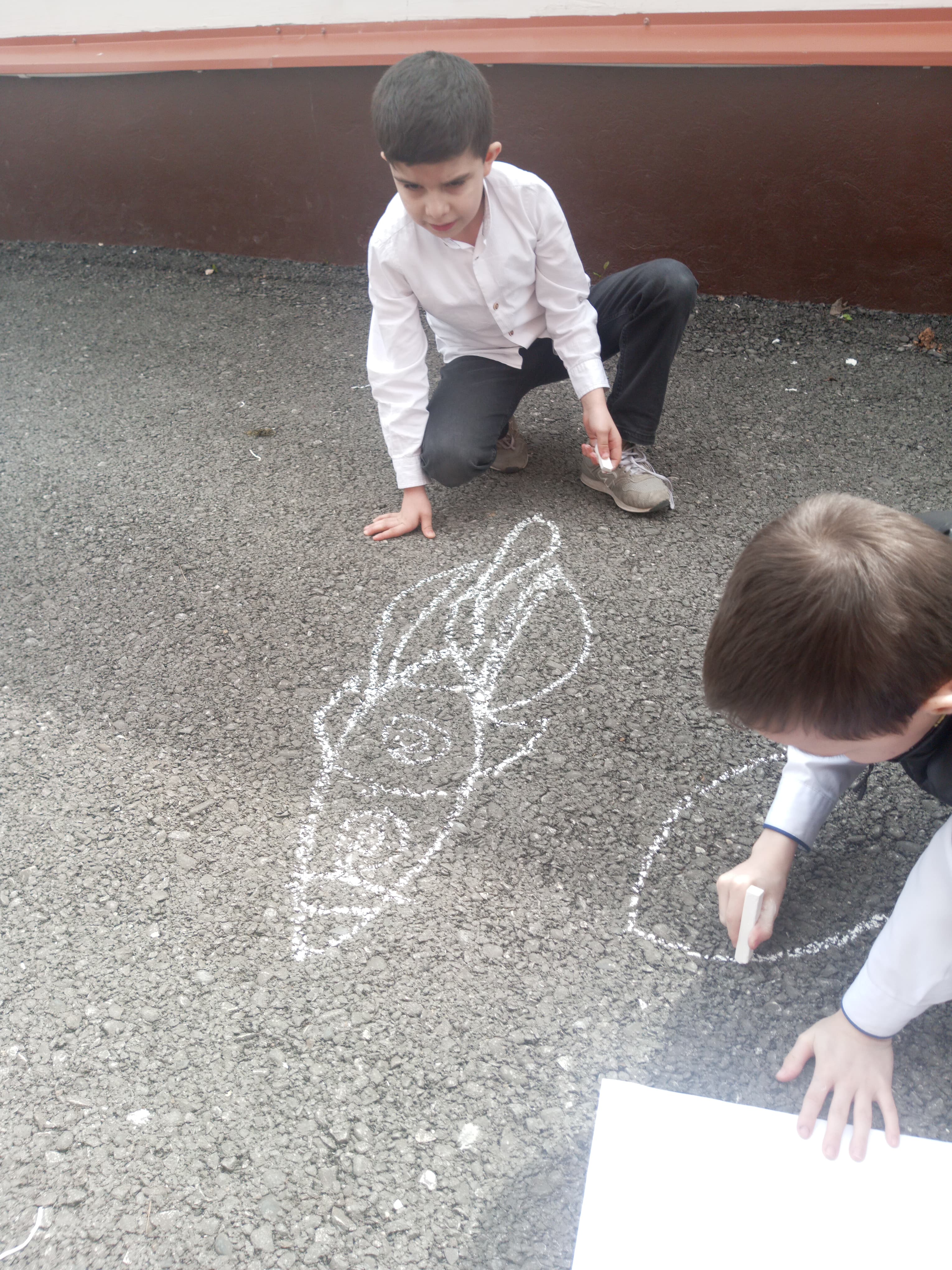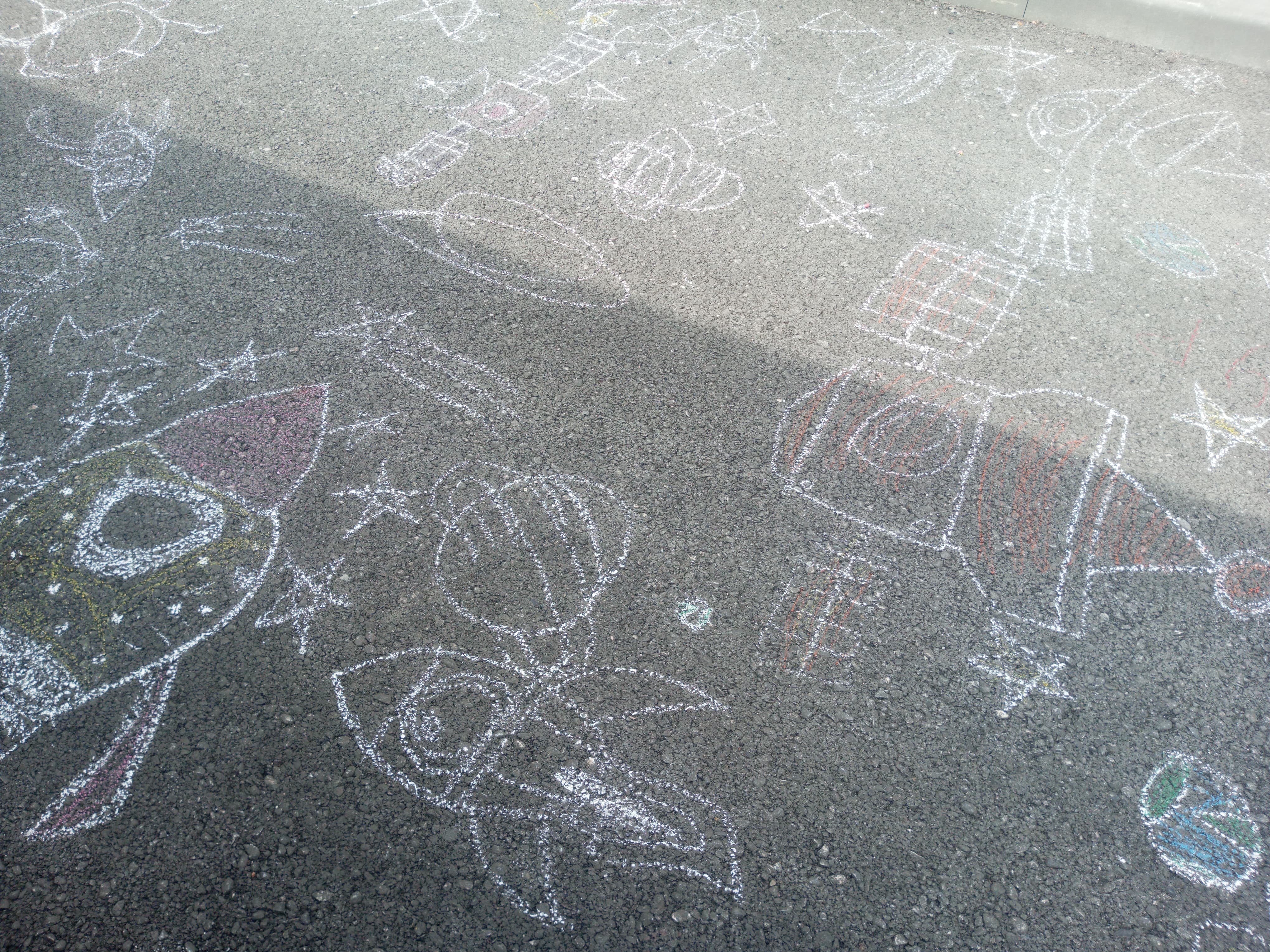 Ребята с большим увлечением играли цветными мелками, и вскоре асфальт на территории гимназии покрылся яркими рисунками. В них дети изображали ракету, небо со звездами, нарисовали космонавта.  Детское творчество в технике коллективного рисунка мелом на асфальте позволяет не только проявить творческие способности, но зарядиться хорошим настроением и радостью от собственных «шедевров». С днем космонавтики!